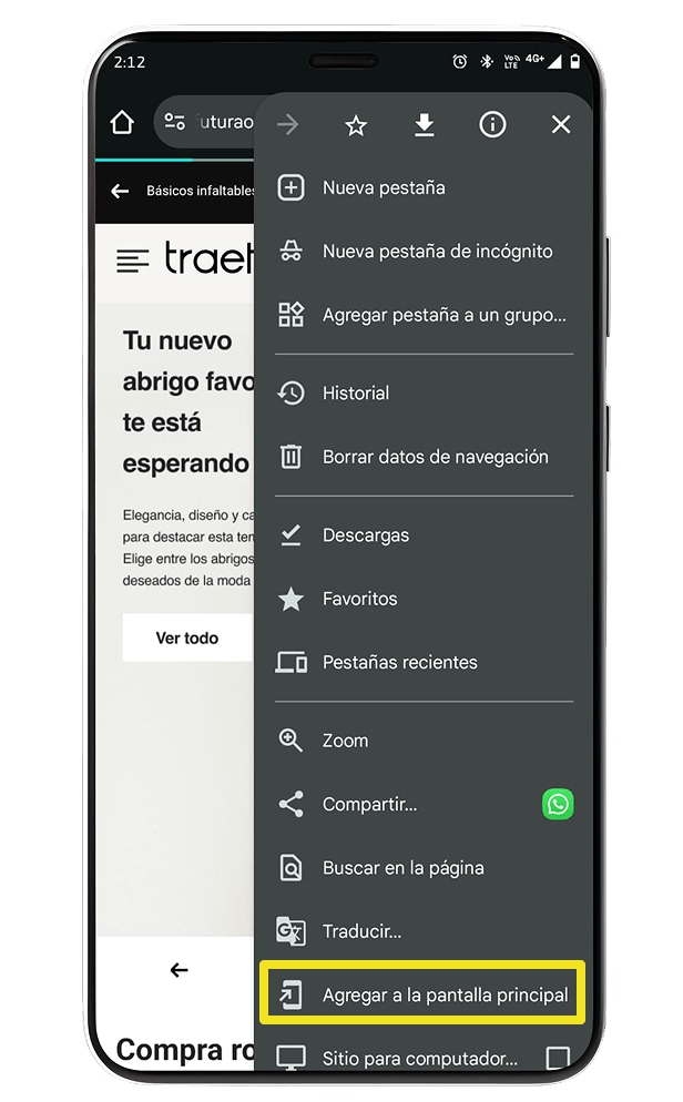 Busca la opción 'Añadir a pantalla de inicio' en tu navegador.