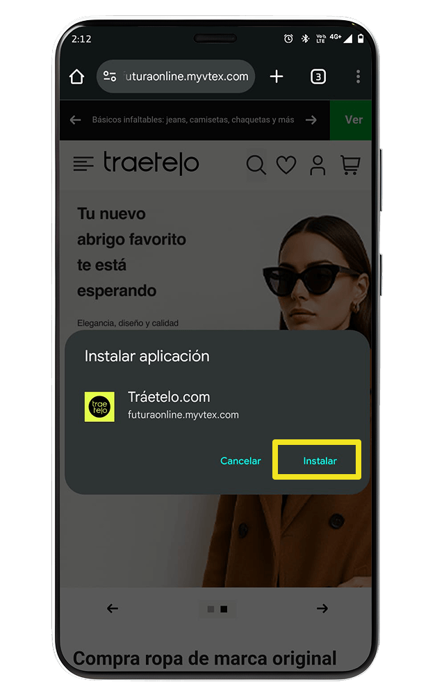 Haz clic o selecciona la opción que corresponda para agregar la aplicación a tu pantalla de inicio o instalarla en tu dispositivo.